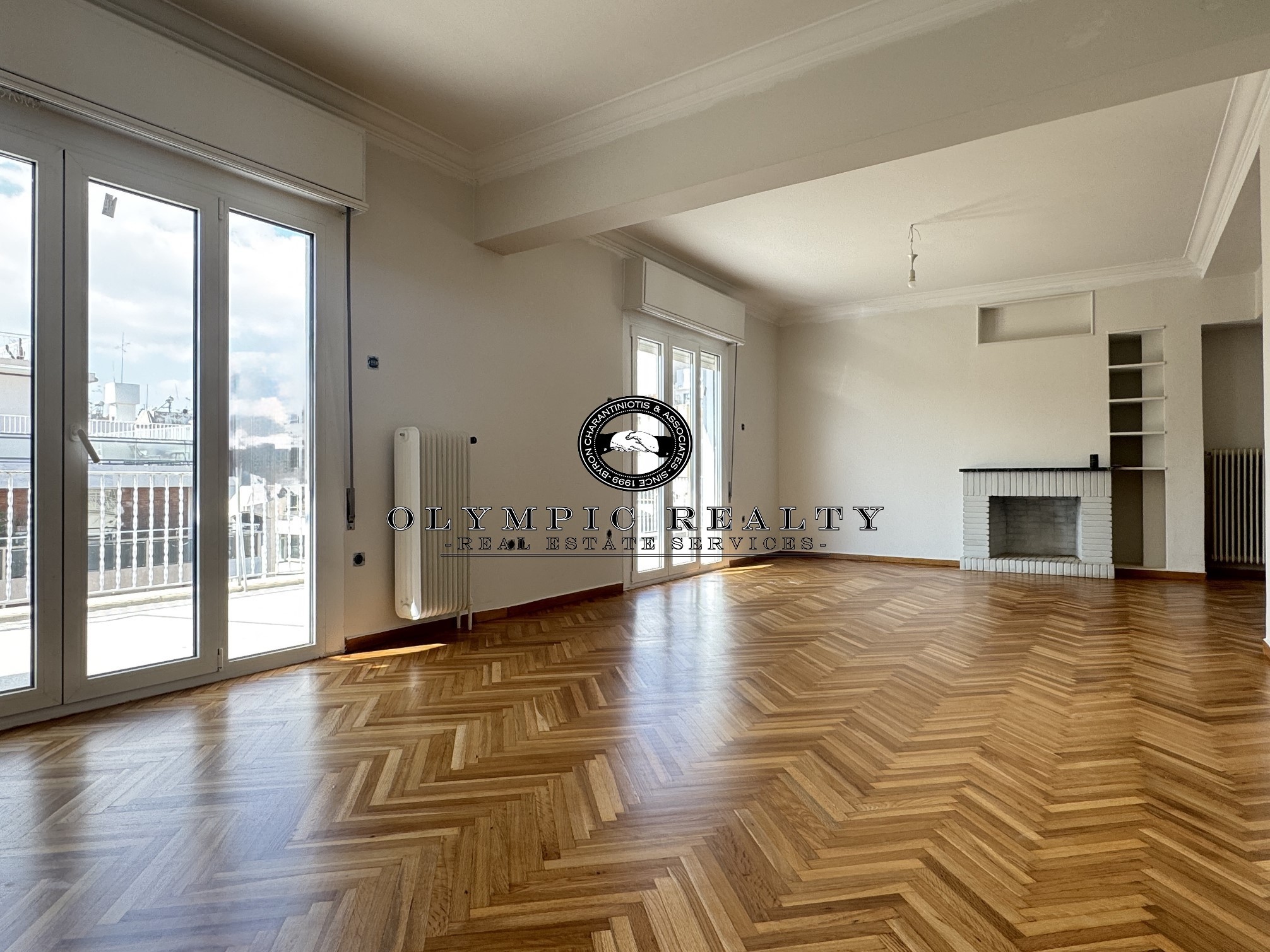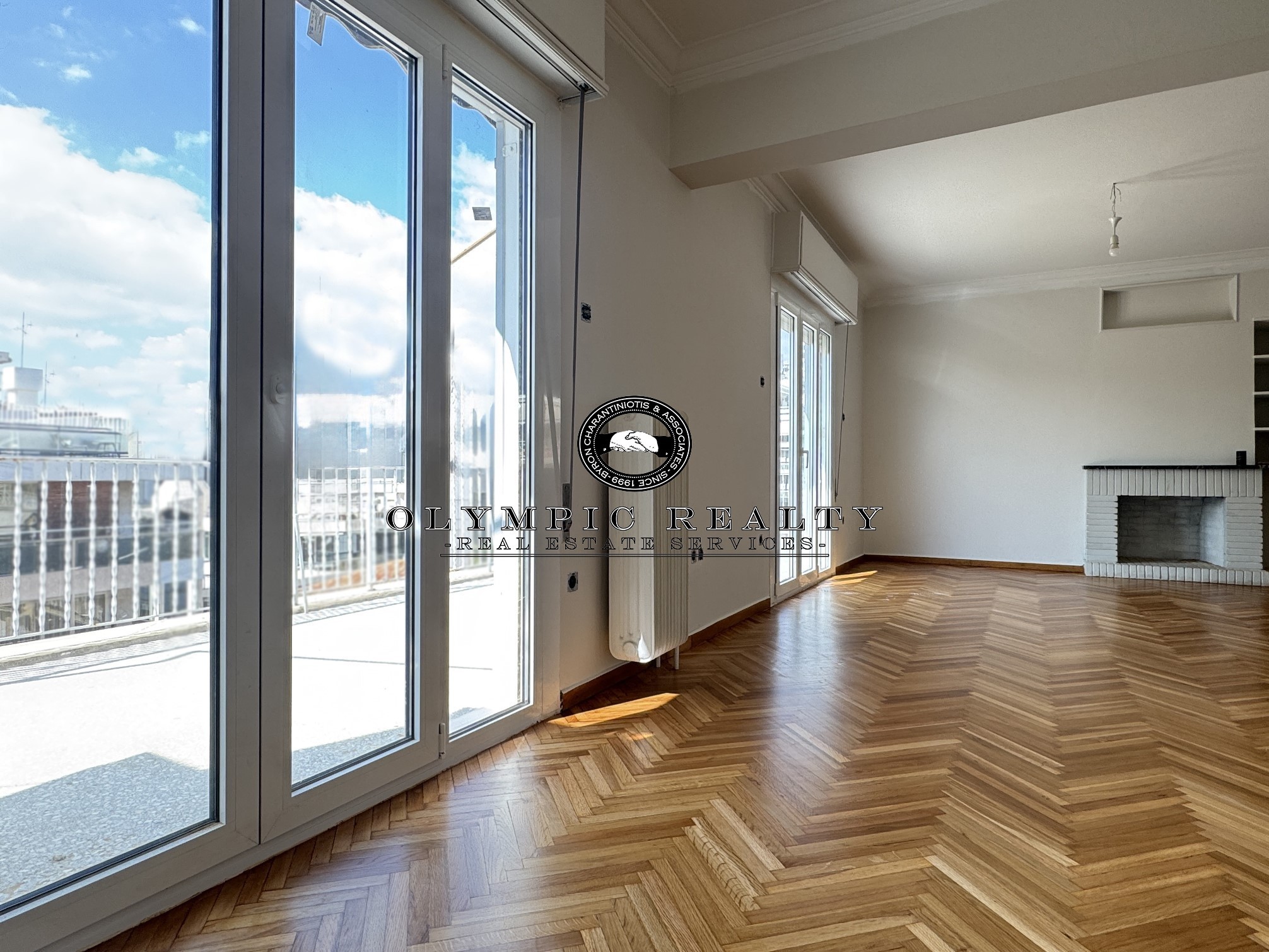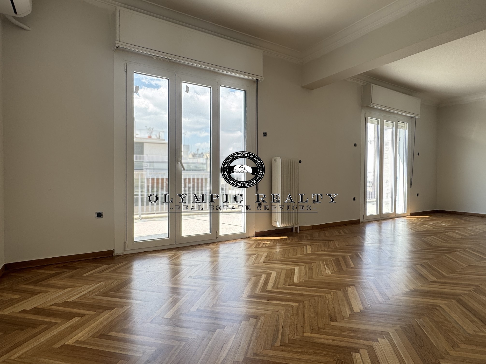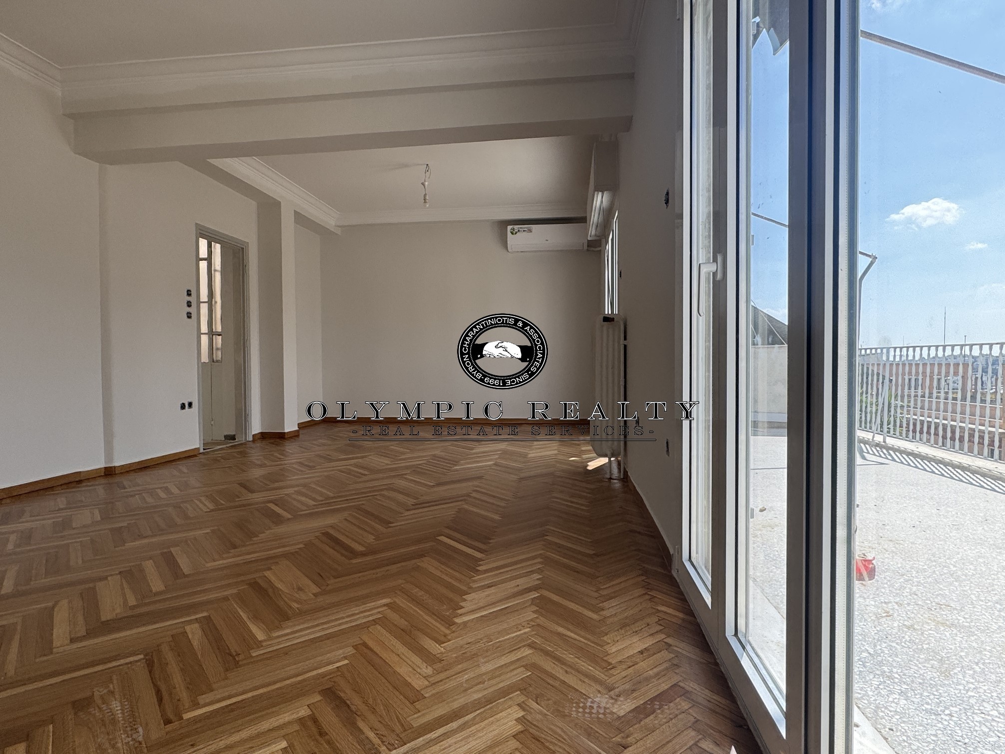 In a very good location, penthouse apartment of 110 sq.m., 6th floor, consisting of a large living room with fireplace and access to a very large terrace with awnings, renovated ergonomic independent kitchen, 2 spacious bedrooms, bathroom and wc. It has aluminum frames with double glazing, air conditioning cooling – heating in all areas, security door, etc. Renovation March 2026. Code: 3293