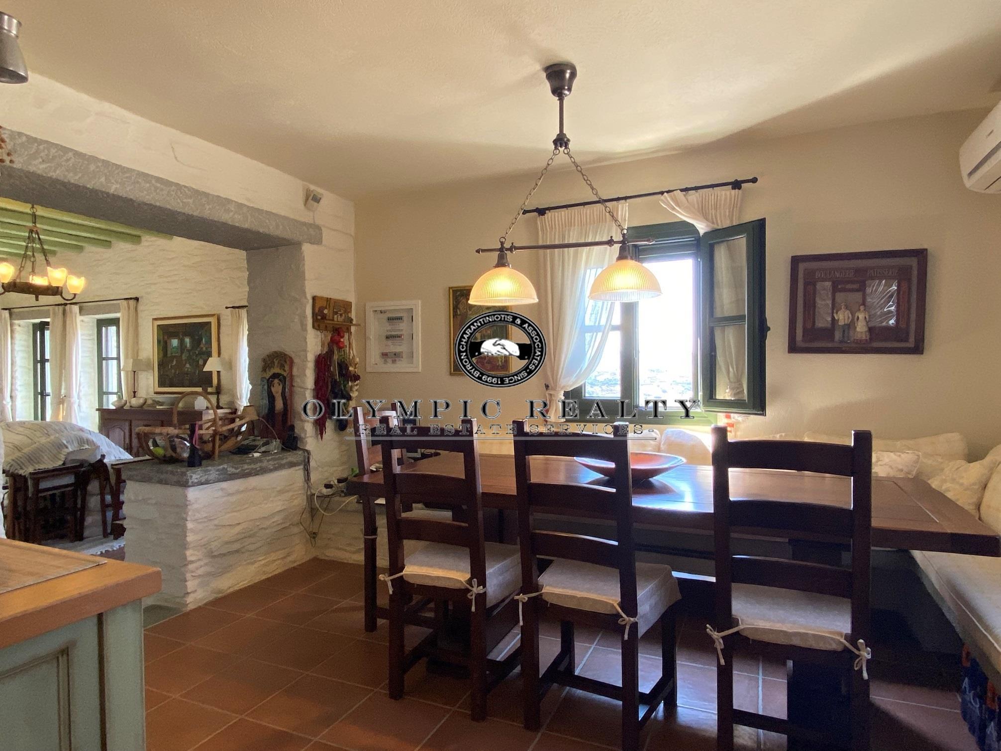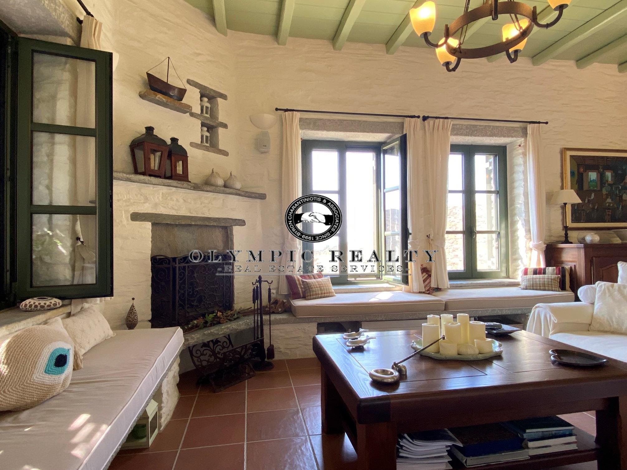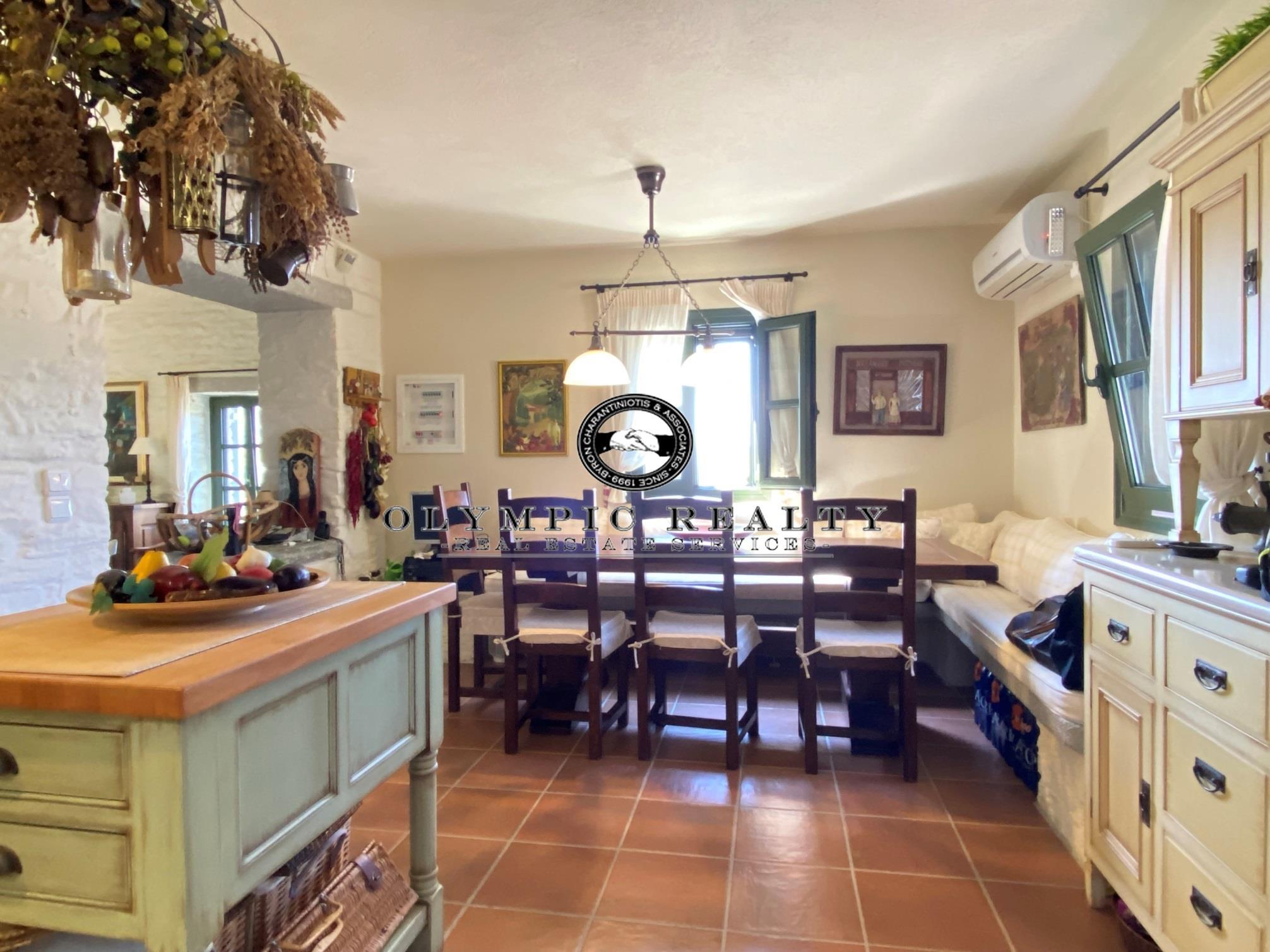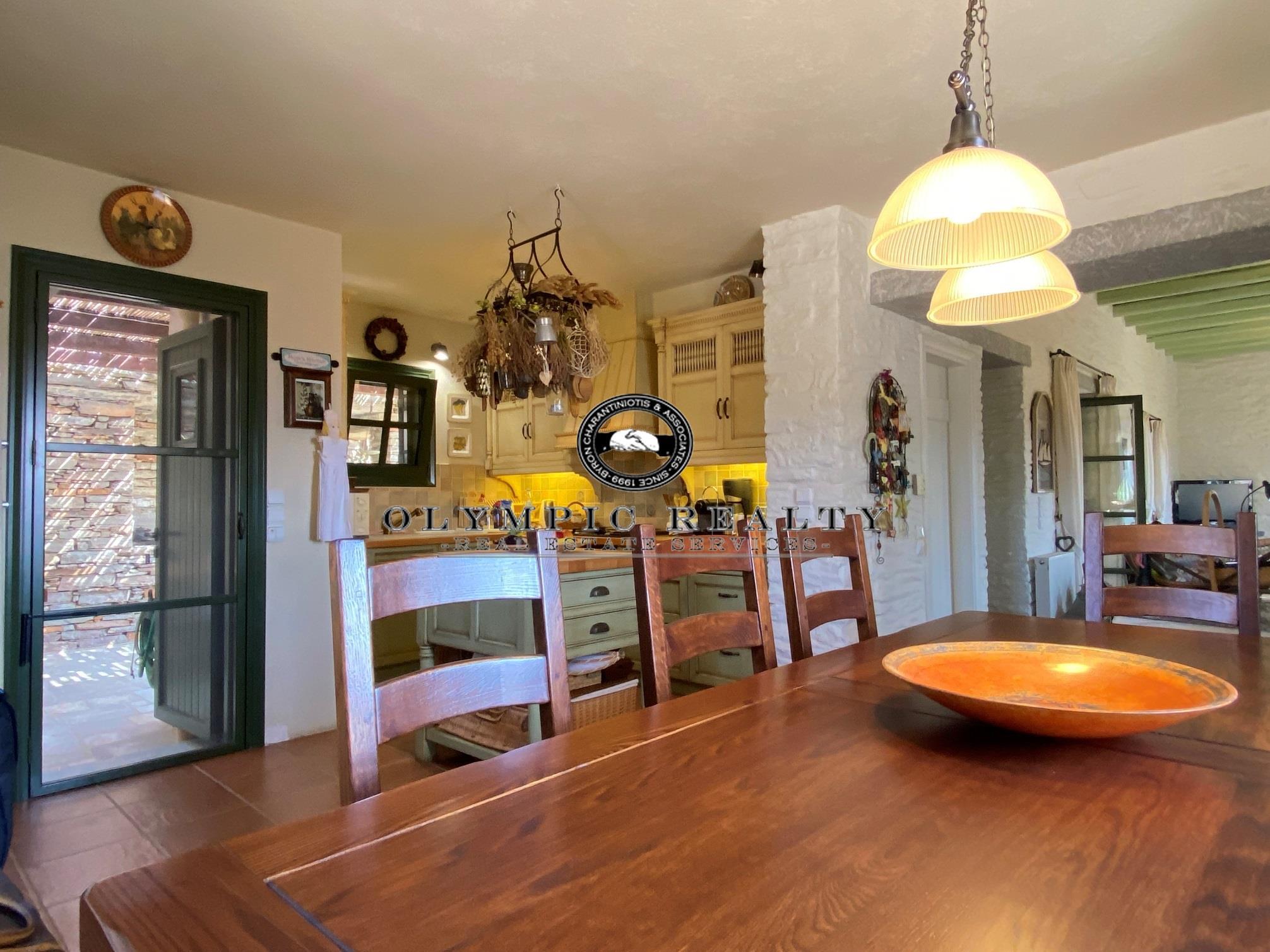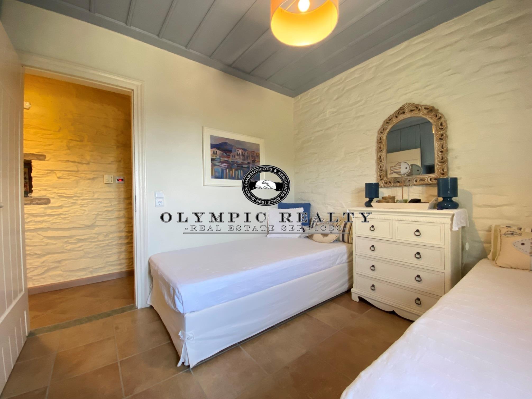 Η υπέροχη αυτή Βίλα έχει χτιστεί σε ένα απομονωμένο και αμφιθεατρικό σημείο του κόλπου, με γνώμονα την ιδιωτικότητα και την προσαρμογή της στο φυσικό τοπίο, σε ένα εξαιρετικά ήσυχο και ήρεμο περιβάλλον μακριά από την πολυκοσμία. Είναι μόλις 10 λεπτά από το λιμάνι και 7 λεπτά από το Βουρκάρι. Πρόκειται για μια κατοικία 4 εποχών ιδιαίτερης αρχιτεκτονικής, παραδοσιακού νησιώτικου ύφους (Τζιάς), συνολικής επιφάνειας 296 τ.μέτρων επί οικοπέδου 4.300 τ.μέτρων. Είναι απόλυτα εναρμονισμένη στο περιβάλλον όντας κατασκευασμένη με Τζιώτικη πέτρα (που συγκεκριμένα έχει εξαχθεί από το σημείο που χτίστηκε), ξύλο, τσιμεντοκονία, μάρμαρο και πέτρα από μοναδικούς τεχνίτες. Η αίσθηση που επικρατεί εντός της κατοικίας είναι η ειδυλλιακή ατμόσφαιρα και η θέα από τα διαμπερή ανοίγματα που είναι ειδικά σχεδιασμένα για να επεκτείνει τους άνετους χώρους της προς τον μεγάλο εξωτερικό χώρο και το χώρο της πισίνας που βρίσκεται ακριβώς μπροστά. Η κατοικία αναπτύσσεται σε 2 επίπεδα και διαθέτει μεγάλο living room – σαλόνι, ευρύχωρη και εργονομική κουζίνα, 4 υπνοδωμάτια εκ των οποίων το 1 master, και έχει έναν (1) ξενώνα ο οποίος ουσιαστικά είναι πλήρως αυτόνομος με δική του κουζίνα και λουτρό. Διαθέτει μεταξύ άλλων για τη λειτουργία της κατοικίας, κλιματισμό (air-condition) σε όλους τους χώρους, κεντρικό σύστημα θέρμανσης με καλοριφέρ, τζάκι, συναγερμό, κάμερες κλειστού κυκλώματος, κουφώματα αλουμινίου με διπλά τζάμια με παντζούρια και σίτες, εντοιχισμένες ηλεκτρικές συσκευές κα. Ο περιβάλλοντας χώρος διαθέτει πισίνα 75 τ.μέτρων, και οργανωμένο επαγγελματικό γήπεδο Τένις με υψηλή περίφραξη. Το οικόπεδο της κατοικίας έχει ομαλές κλίσεις στο οποίο έχουν δημιουργηθεί στάθμες για εύκολη πρόσβαση σε όλα του τα σημεία, είναι φυτεμένο με ελαιοδεντρα και θαμνοειδή δέντρα και καλλωπιστικά φυτά με αυτόματο πότισμα, ενώ είναι περιφραγμένο με πέτρινο τοίχο που διαθέτει ανοίγματα με πόρτες και γκαραζόπορτα για τις θέσεις στάθμευσης οχημάτων με σκεπαστό parking. Η κατοικία είναι άριστα συντηρημένη και έτοιμη προς χρήση. Παραδίδεται άμεσα. Κωδικός : 3276